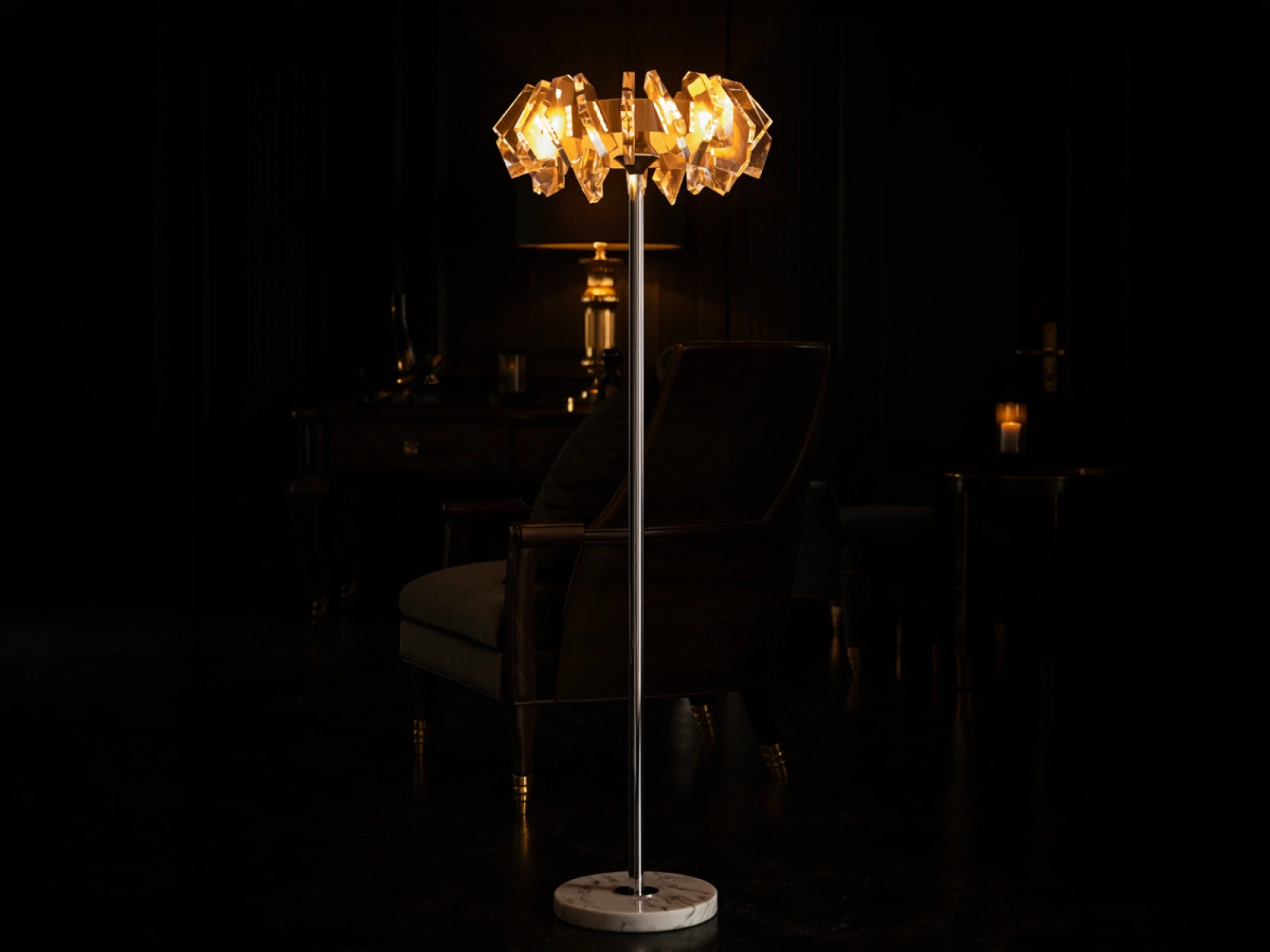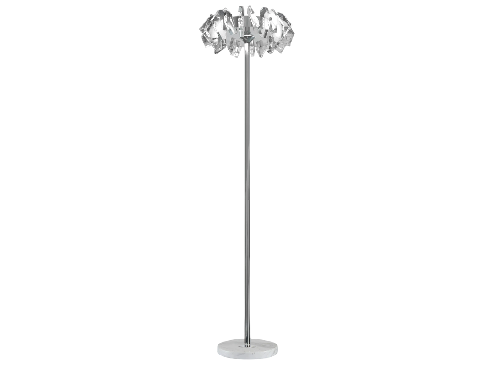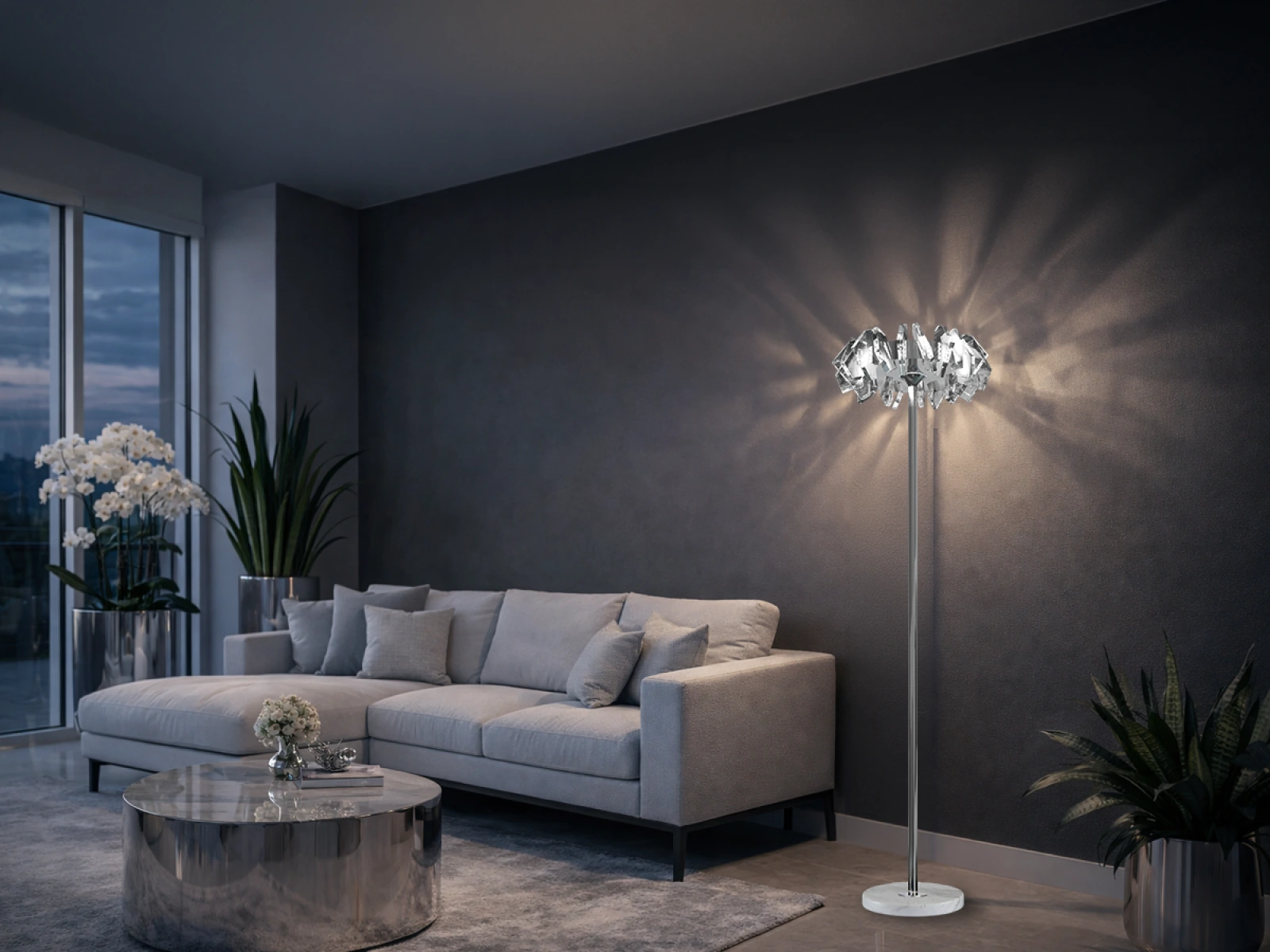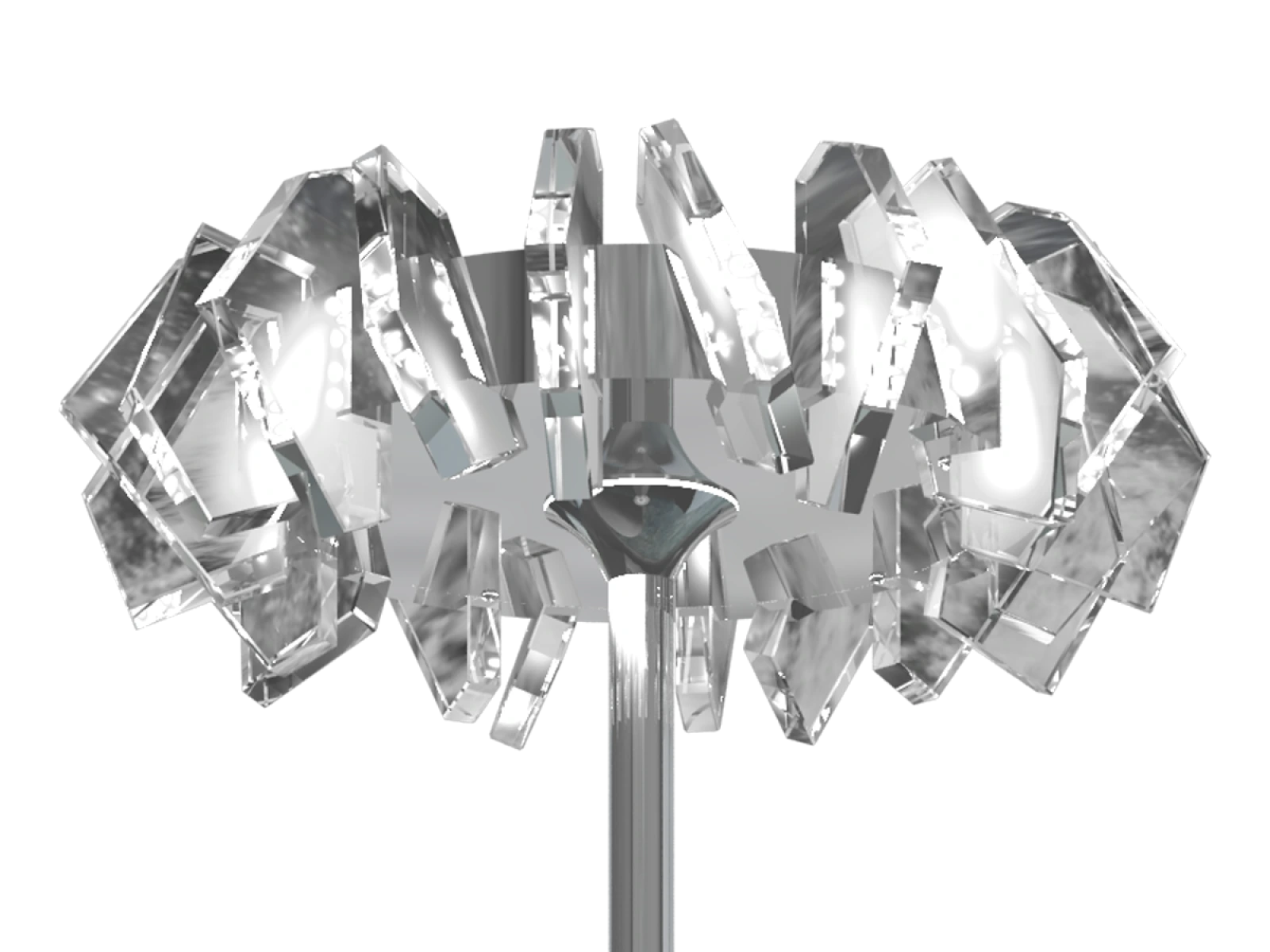 Konstrukce je vyrobena z vysoce kvalitní oceli s chromovanou povrchovou úpravou a doplněna originálními, přesně broušenými křišťálovými prvky, které zajišťují intenzivní lom a odraz světla. Výsledkem je luxusní světelná atmosféra s výrazným dekorativním efektem, která podtrhne charakter moderních i reprezentativních interiérů.