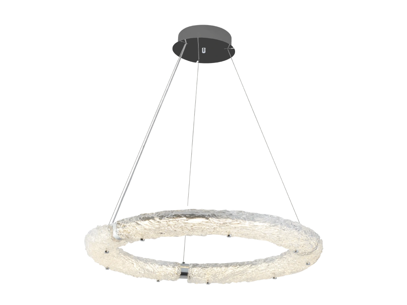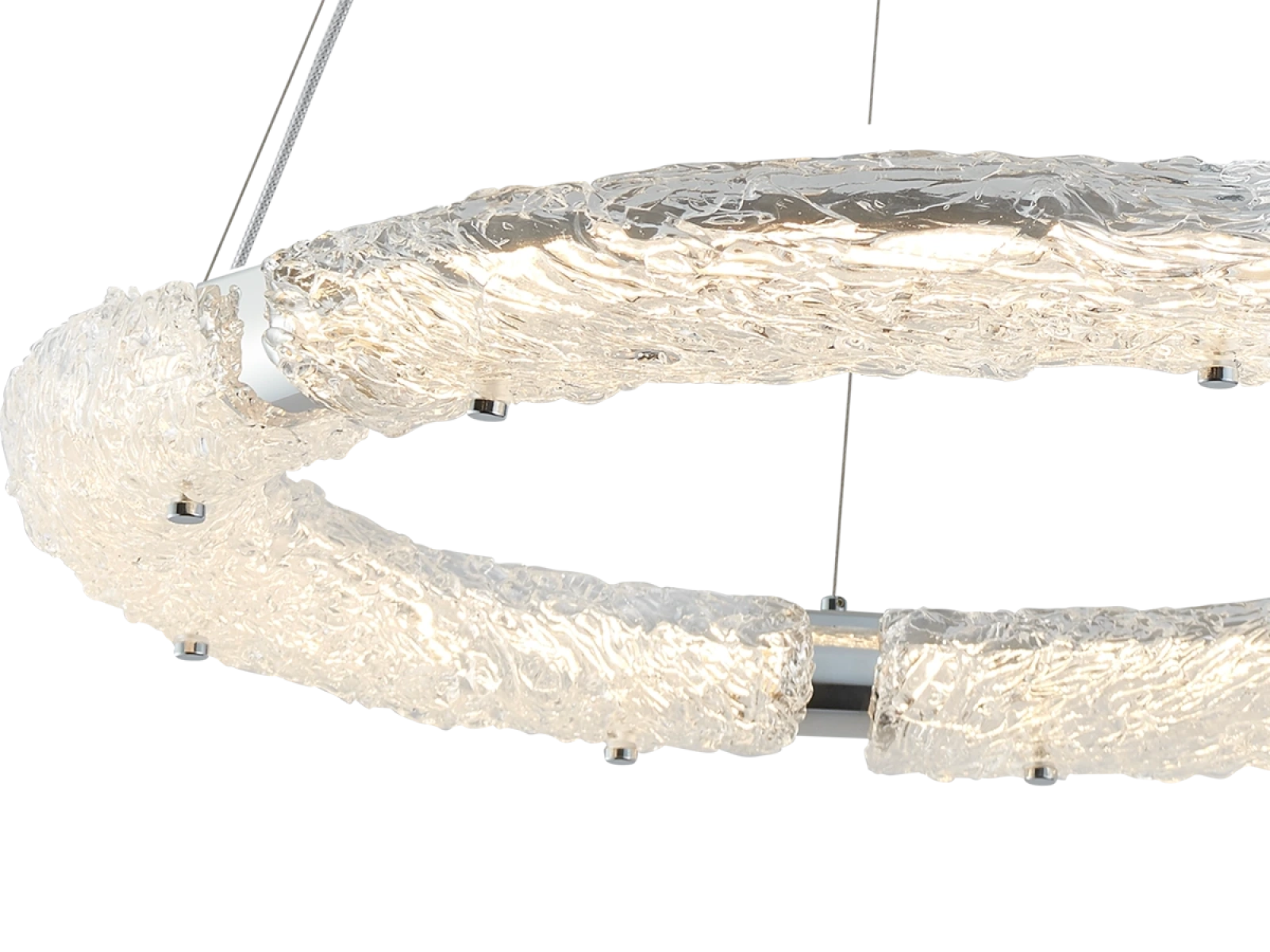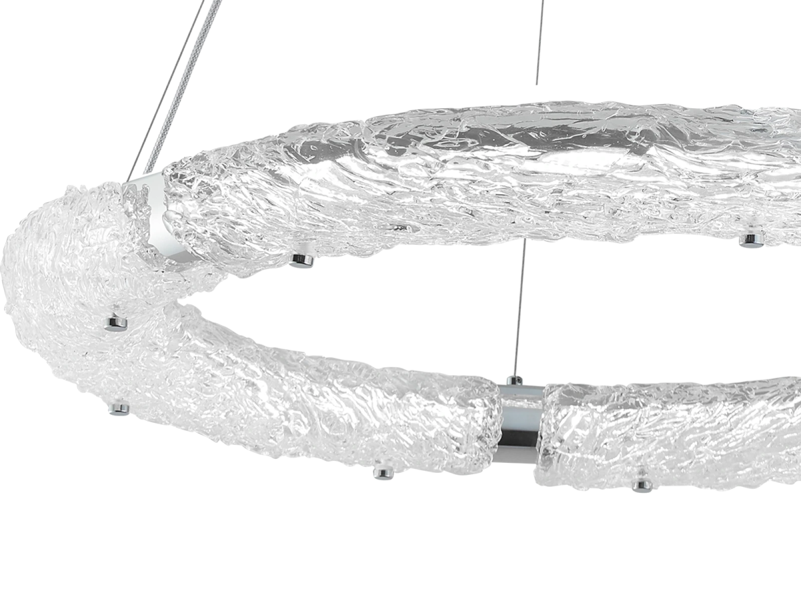 Svítidlo je vyrobeno z vysoce kvalitního nerezového kovu s chromovou povrchovou úpravou, která zajišťuje dlouhou životnost, stabilitu a luxusní vzhled. Skleněné prvky s texturovaným povrchem inspirovaným kůrou zajišťují rovnoměrné a příjemné rozptýlení světla.