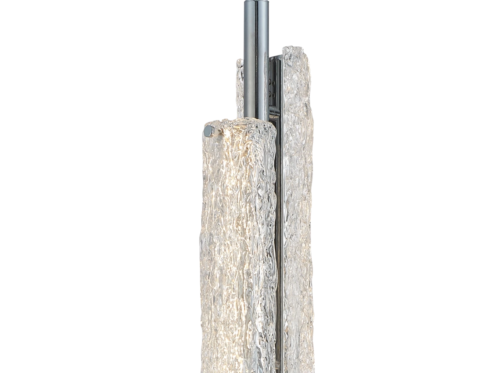 Svítidlo je vyrobeno z vysoce kvalitního nerezového kovu s chromovou povrchovou úpravou, která zajišťuje dlouhou životnost, stabilitu a luxusní vzhled. Skleněné prvky s texturovaným povrchem inspirovaným kůrou zajišťují rovnoměrné a příjemné rozptýlení světla.