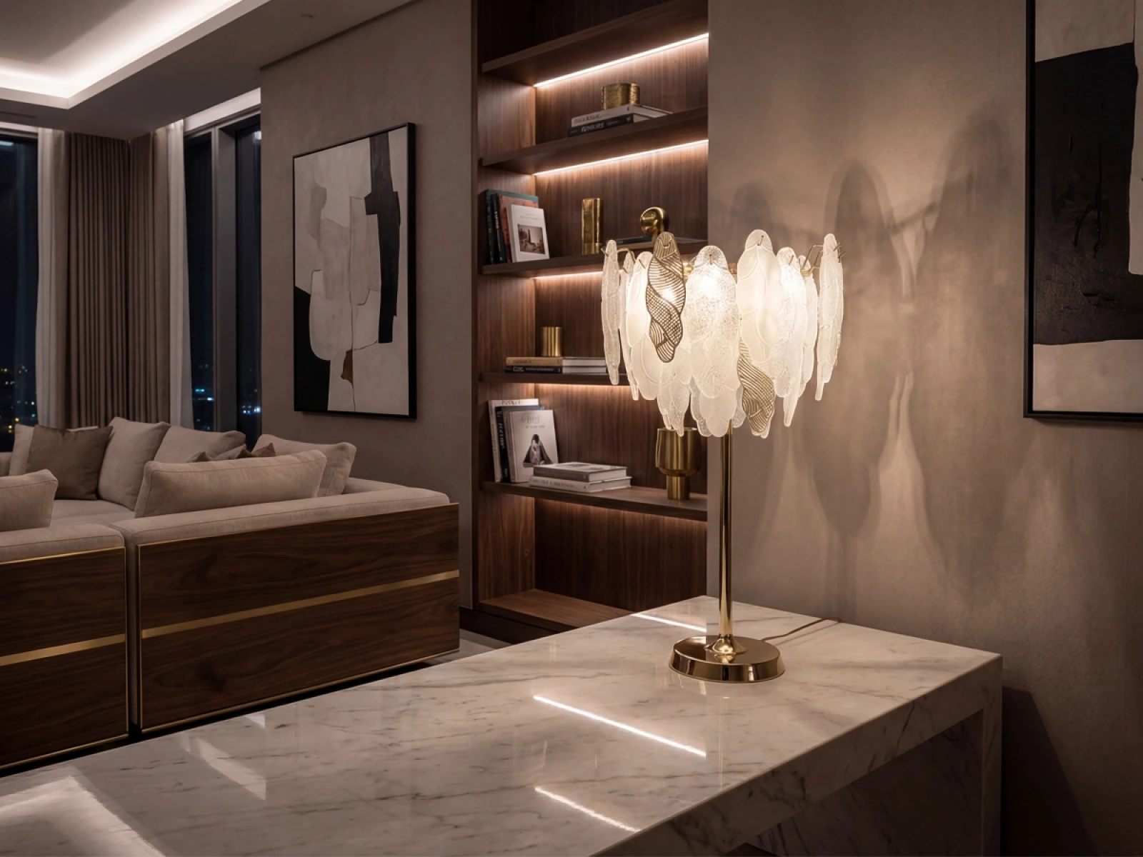 Stolní lampa CHOREO od společnosti VIZARDI je elegantní designové osvětlení s výrazným dekorativním charakterem. Precizní uspořádání jednotlivých prvků vytváří harmonickou kompozici s jedinečným světelným efektem a dodává prostoru výrazný vizuální akcent. Svítidlo je vhodné do obývacího pokoje, jídelny, ložnice a reprezentativních interiérů.