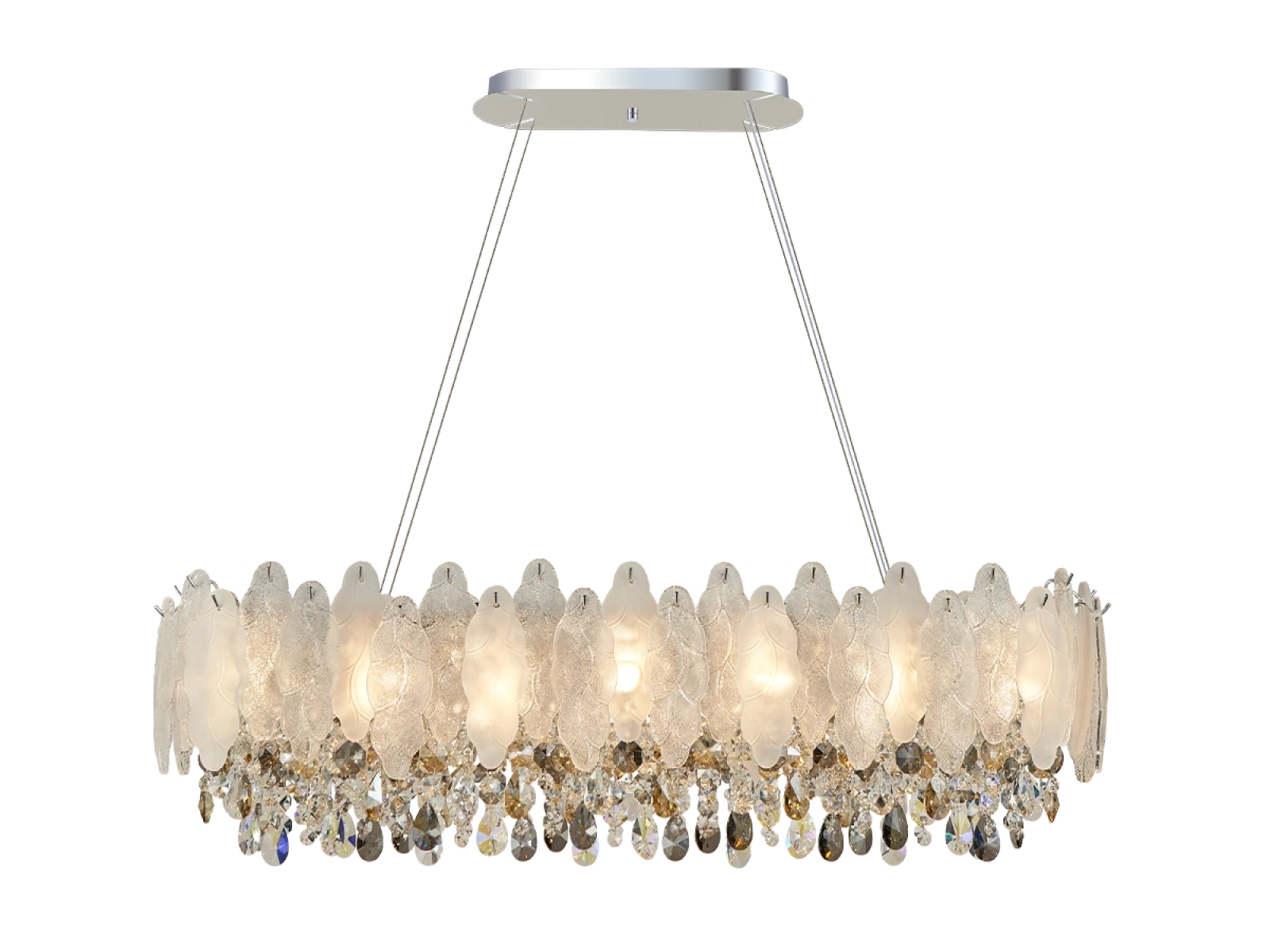 Kovovou konstrukci v kvalitním provedení doplňují skleněné a broušené křišťálové prvky, které jemně rozptylují světlo a vytvářejí decentní světelný efekt. Lampa působí vkusně a nadčasově, s důrazem na detail a kvalitní zpracování.