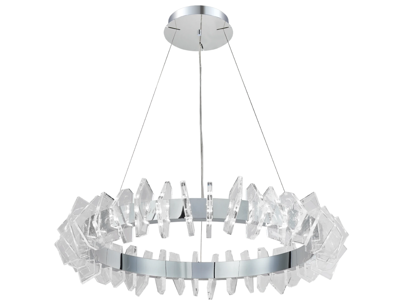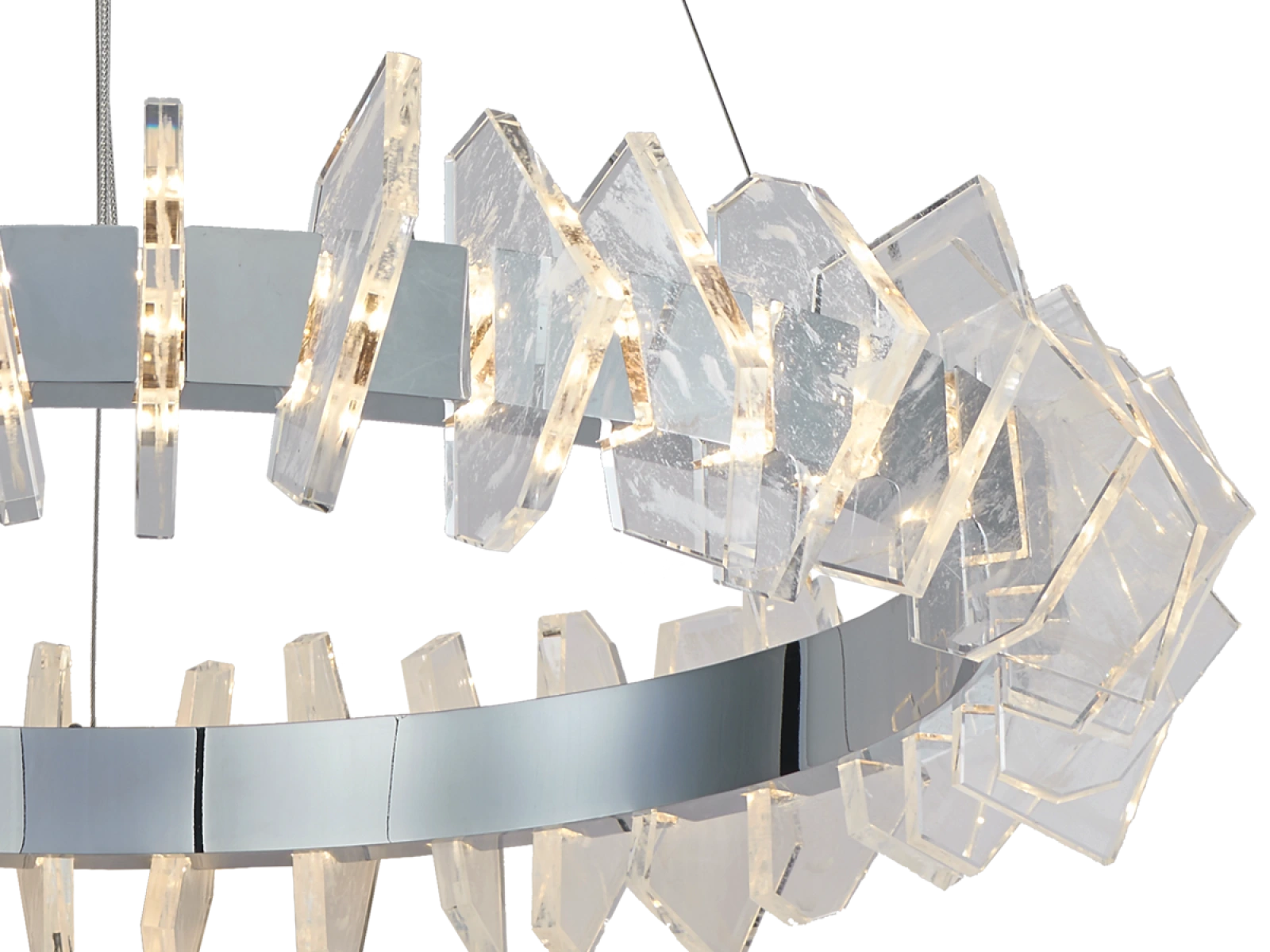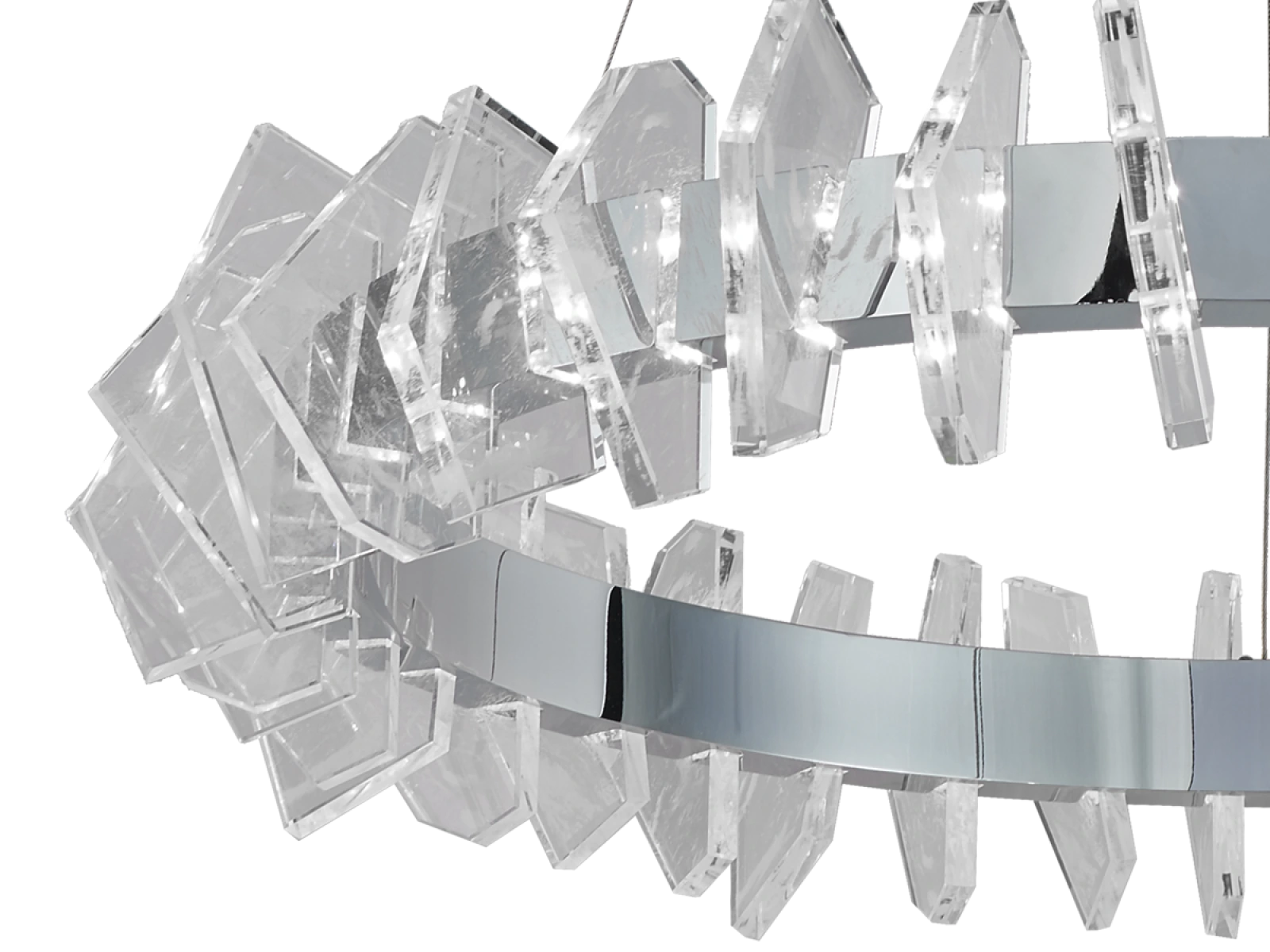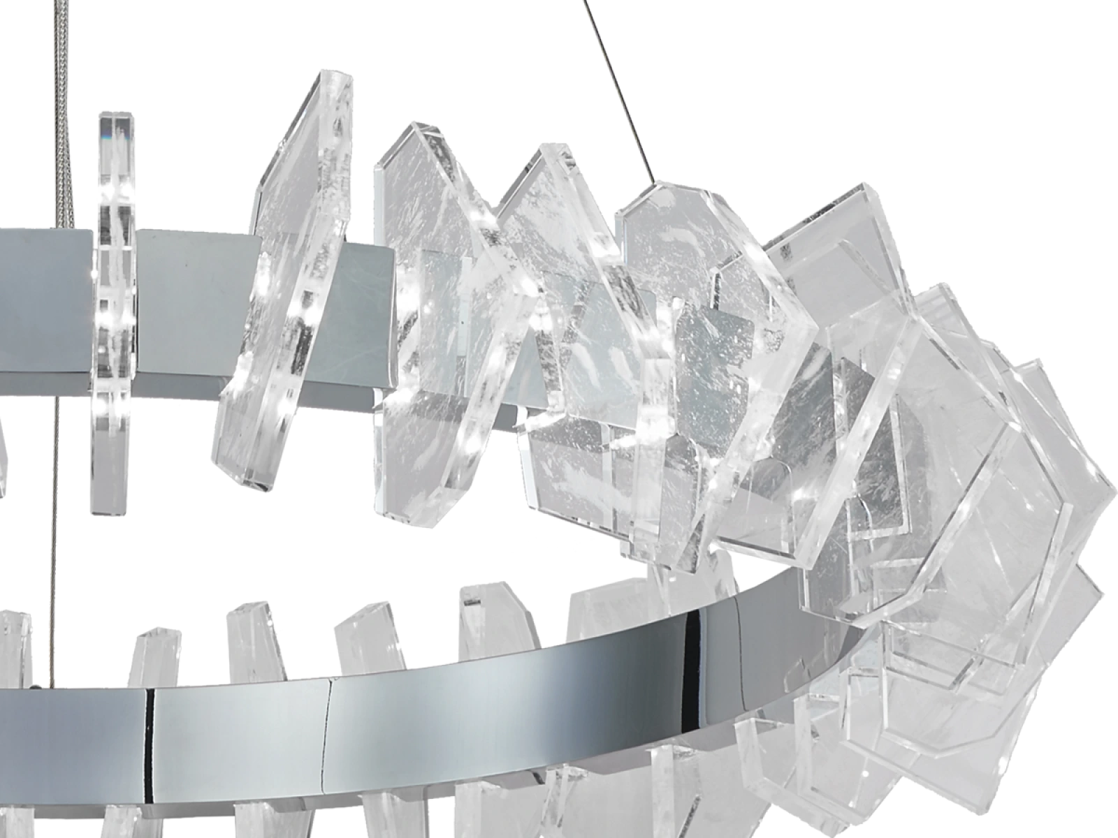 Konstrukce je vyrobena z vysoce kvalitní oceli s chromovanou povrchovou úpravou a doplněna originálními, přesně broušenými křišťálovými prvky, které zajišťují intenzivní lom a odraz světla. Výsledkem je luxusní světelná atmosféra s výrazným dekorativním efektem, která podtrhne charakter moderních i reprezentativních interiérů.