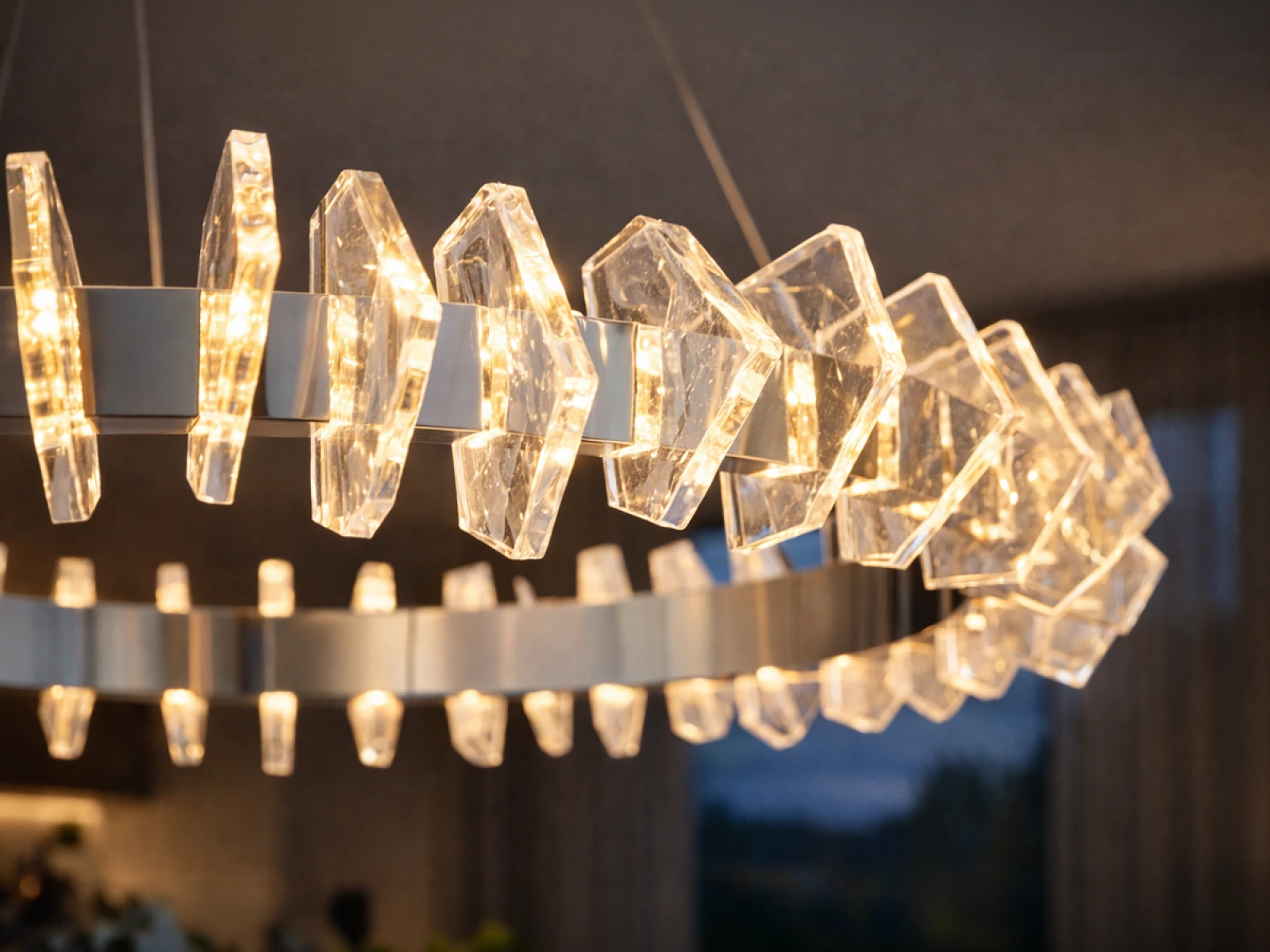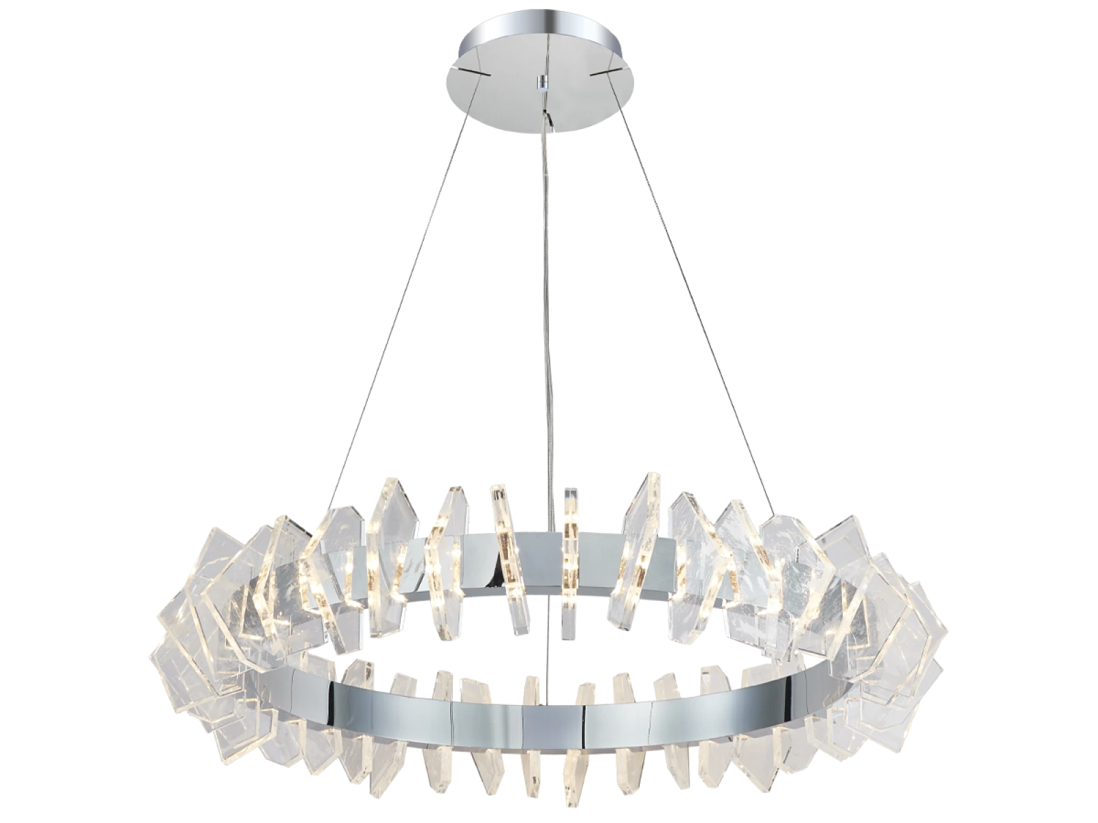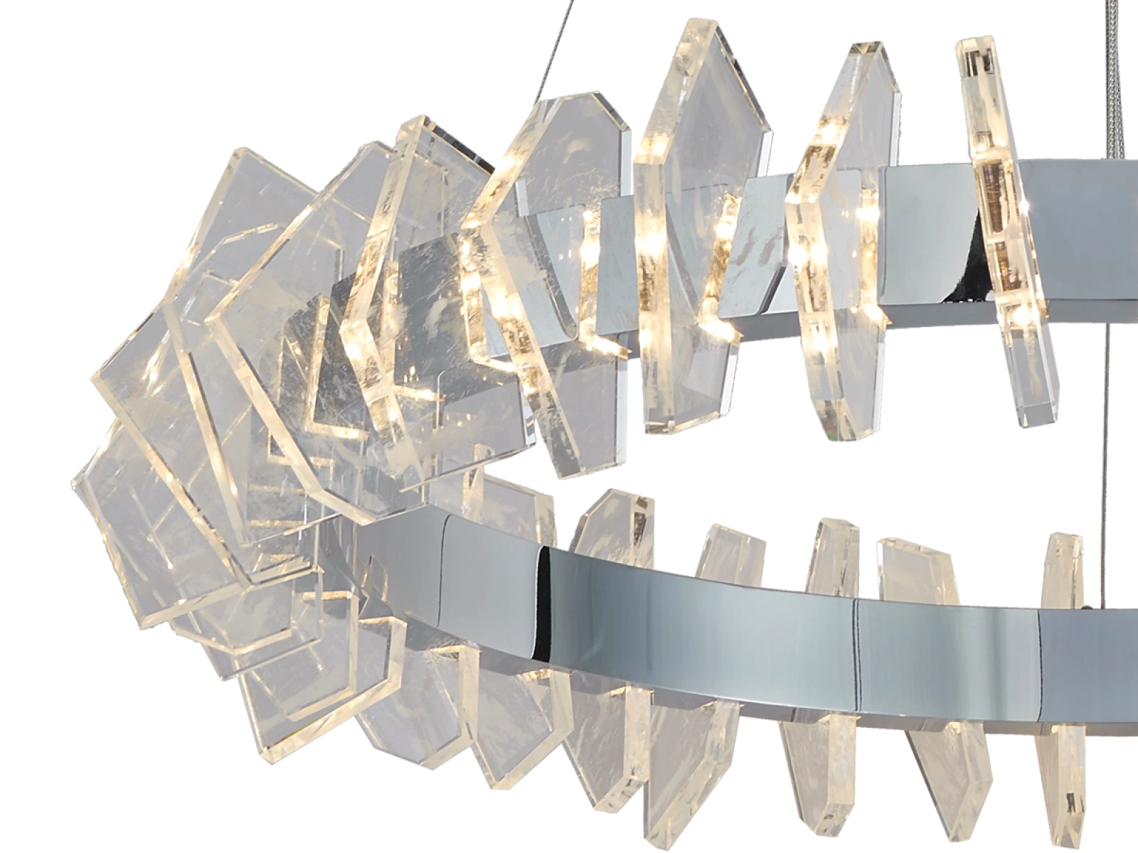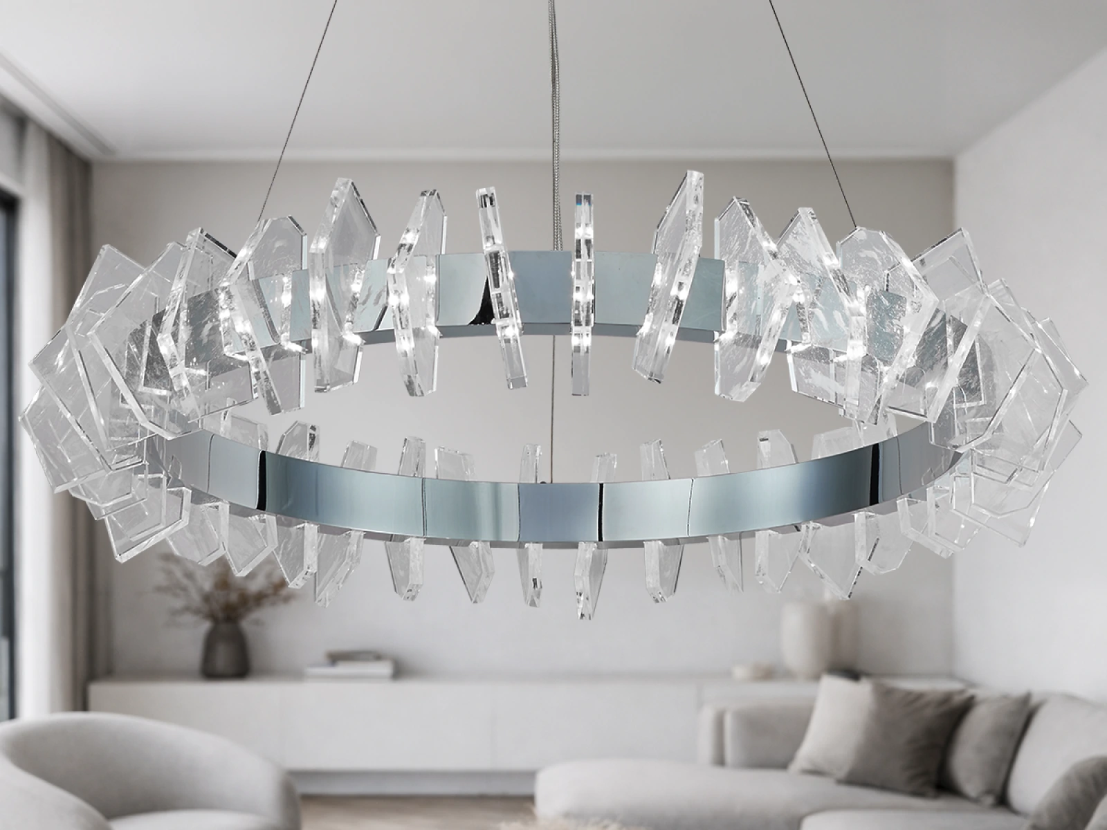 Konstrukce je vyrobena z vysoce kvalitní oceli s chromovanou povrchovou úpravou a doplněna originálními, přesně broušenými křišťálovými prvky, které zajišťují intenzivní lom a odraz světla. Výsledkem je luxusní světelná atmosféra s výrazným dekorativním efektem, která podtrhne charakter moderních i reprezentativních interiérů.