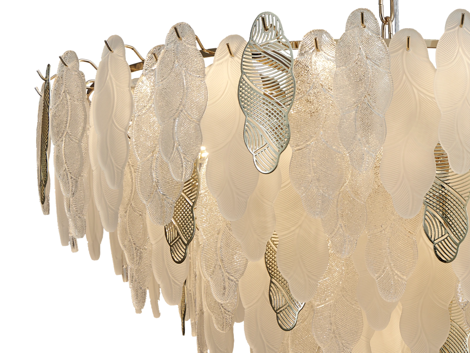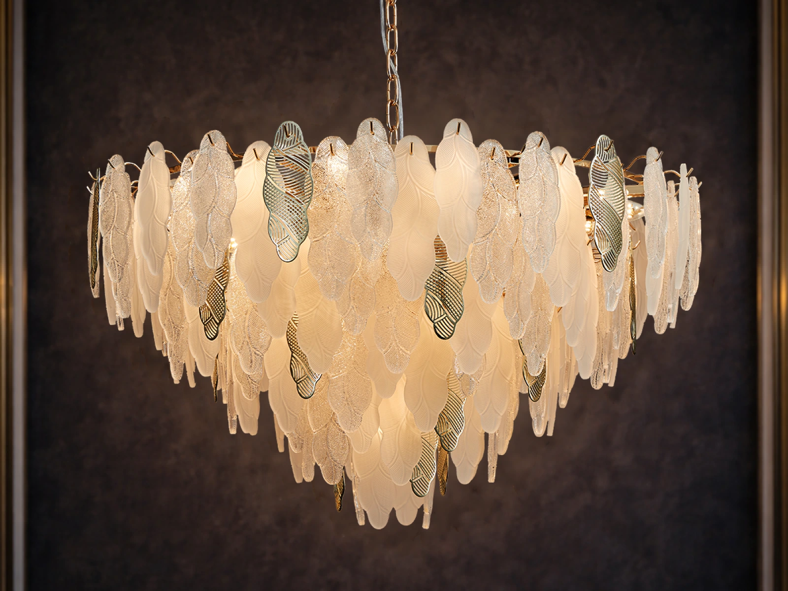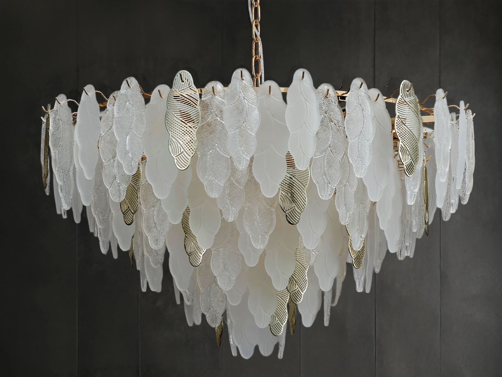Jemná struktura skleněných prvků v kombinaci s dekorativními kovovými detaily podtrhuje luxusní a sofistikovaný charakter této kolekce.
