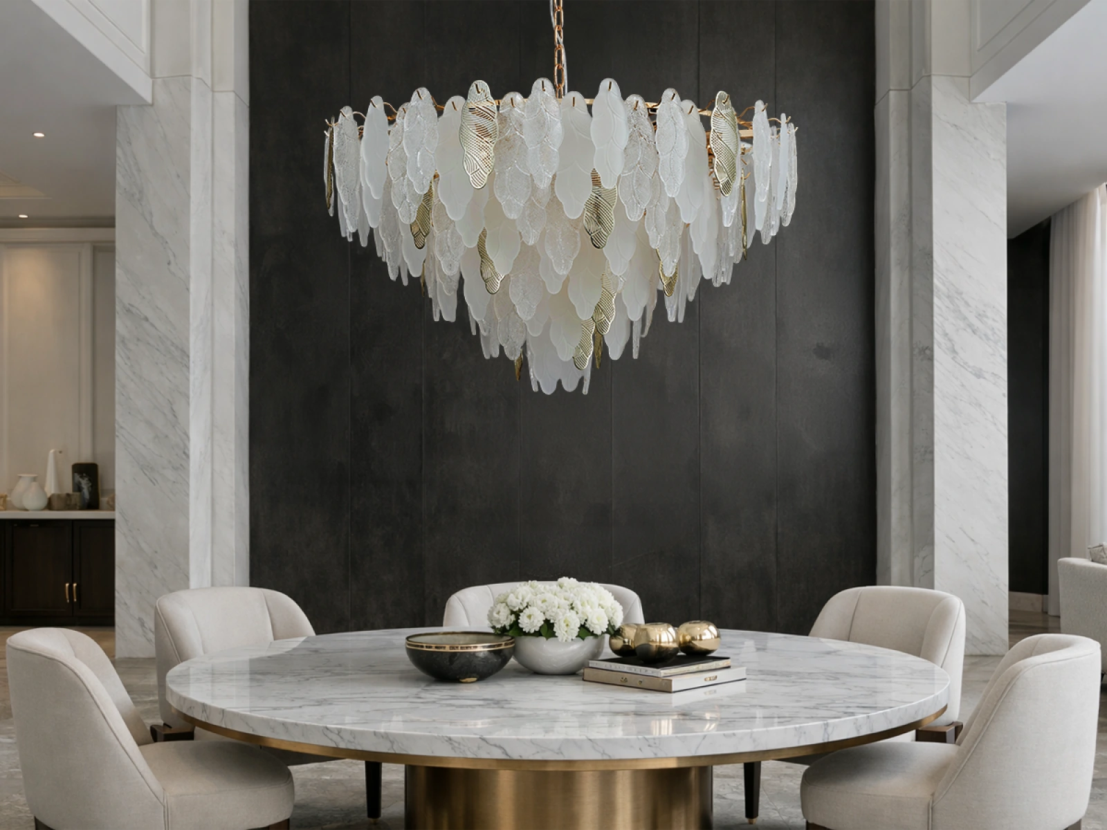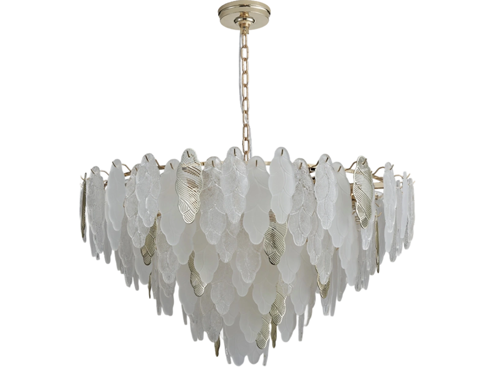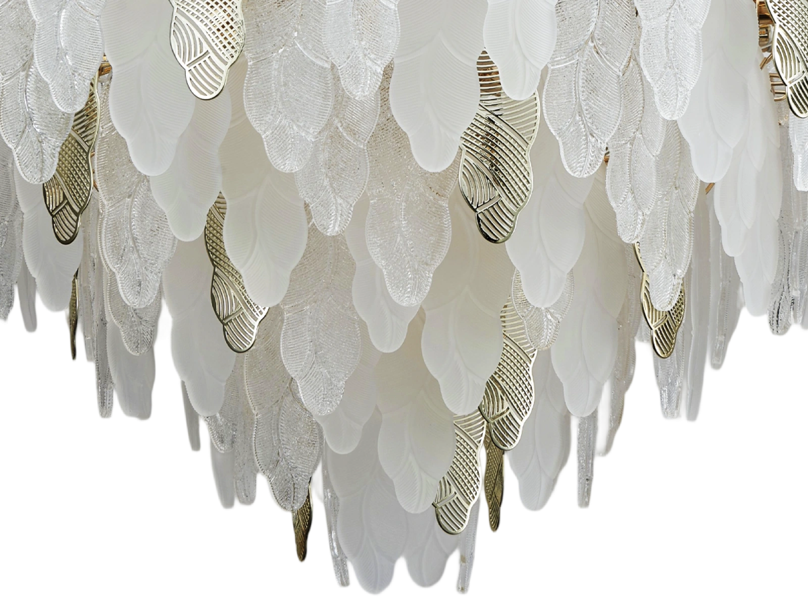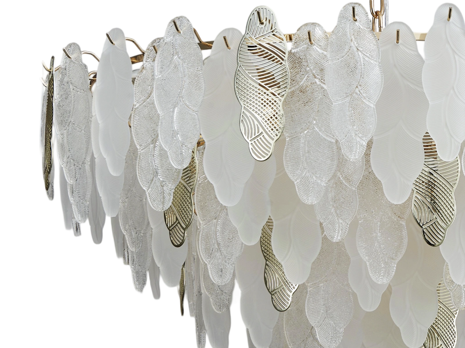 Jemná struktura skleněných prvků v kombinaci s dekorativními kovovými detaily podtrhuje luxusní a sofistikovaný charakter této kolekce.